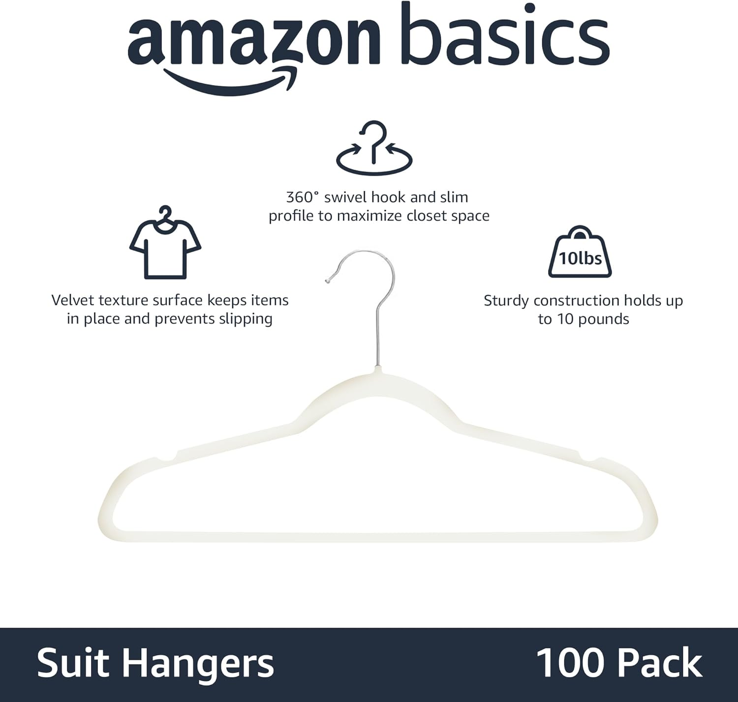 Amazon Basics Slim, Velvet, Non-Slip, Space-Saving Suit Clothes Hangers, Pack of 100, Ivory/Beige