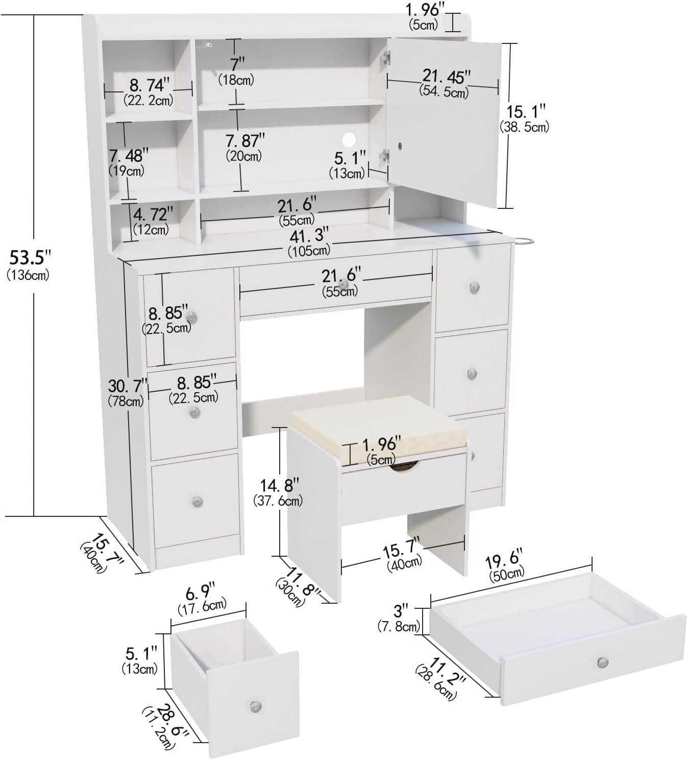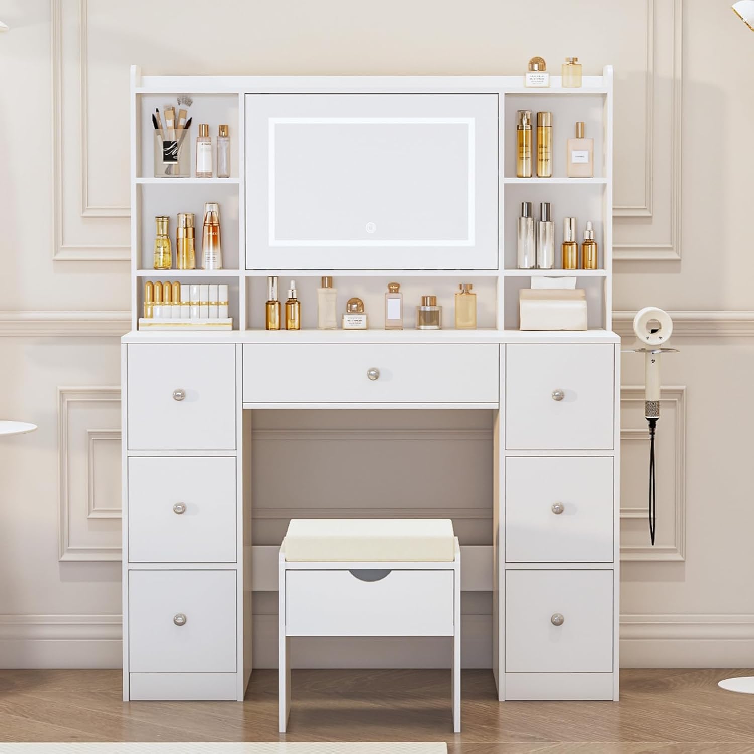 Large Vanity Table with Mirror & Lights - Built-in Power Outlet, Dimmable LED Lighting, 7 Compartments & 7 Drawers - Includes Padded Stool - Ideal Bedroom Makeup Dressing Station (White)